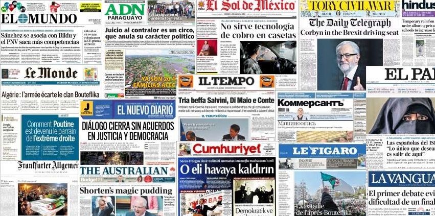 Une sélection des unes de presse et des principaux sujets d'actualité du jour qui ont été traités, analysés et commentés dans les médias internationaux. L'essentiel du 03-04-2019Synthèse de l'actualité internationale du 3 avril 2019. Principaux points chauds de l'actualité mondiale traités par les médias internationaux: en Algérie, au cameroun, au Mali, au Canada, aux Etats-Unis, au Pérou, au Venezuela, à Bruneï, en Iran, en Malaisie, en Syrie, au Royaume-Uni, en Russie, en Suisse et en Ukraine. L'essentiel du 02-04-2019Synthèse de l'actualité internationale du 2 avril 2019. Principaux points chauds de l'actualité mondiale traités par les médias internationaux: en Afrique du sud, en Algérie, au Burkina Faso, au Canada, au Etats-Unis, au Venezuela, à Bruneï, en Inde, en Turquie, en Grèce, au Royaume-Uni, en Russie et en Nouvelle Zélande. L'essentiel du 01-04-2019Synthèse de l'actualité internationale du 1er avril 2019. Principaux points chauds de l'actualité mondiale traités par les médias internationaux: en Algérie, en RDC, au Brésil, au Canada, au Pérou, au venezuela, en Chine, au Japon, au népal, en Turquie, en France, en Italie, au Royaume-Uni et en Ukraine. L'essentiel du 30-03-2019Synthèse de l'actualité internationale des 30 et 31 mars 2019. Principaux points chauds de l'actualité mondiale traités par les médias internationaux: en Algérie, au Maroc, au Brésil, aux Etats-Unis, au Nicaragua, au Venezuela, en Afghanistan, en Irak, en Palestine, en Turquie, en Espagne, en France, en Slovaquie et en Ukraine. L'essentiel du 29-03-2019Synthèse de l'actualité internationale du 29 mars 2019. Principaux points chauds de l'actualité mondiale traités par les médias internationaux: en Algérie, aux Comores, en Tunisie, au Canada, aux Etats-Unis, au Venezuela, en Arabie, en Allemagne, au Danemark, en France, en Islande, au Royaume-Uni, en Roumanie, en Russie et en Nouvelle Zélande. |