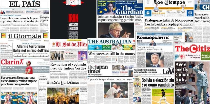 Quelques unes de la presse internationale du 25-11-2019 1) La politique de la Chine menée au Xinjiang est une nouvelle fois dénoncée avec des révélations sur le fonctionnement des camps d’internement des Ouïgours. Baptisées China Cables ces révélations basées sur l'exploitation de fuites de directives internes à l’Etat-Parti chinois, sont le fruit du travail d'investigation de l'ICIJ, un consortium de médias internationaux. L'enquête met en lumière la politique de repression et de détention de masse au Xinjang. 2) Lors des élections locales à Hong Kong ont connu une participation record et un raz-de-marée du camp prodémocratie. L'opposition a rafflé la majorité dans 17 des 18 conseils de district du territoire autonome totalisant 86% des sièges. Cette victoire lui permet aussi d'empocher 117 voix de plus au comité qui élit le chef de l'éxécutif. Il s'agit d'un vote de défiance et de désapprobation au gouvernement dirigé par Carrie Lam et un sérieux revers pour Pékin. 3) En Roumanie, la gauche de Viorica Dancila a enregistré une défaite historique lors de la présidentielle en obtenant que 37% des voix. C'est le président de centre-droit sortant Klaus Iohannis qui l’emporte avec 63% des suffrages. Ce lourd désaveu marque l'échec de la stratégie du Parti social-démocrate à séduire l’électorat rural avec des hausses des aides sociales et un discours à la tonalité souverainiste tournant le dos à l'orientation européenne du pays. 4) Malgré la crise économique qui sévit en Namibie, les élections générales semblent promises au président sortant. Hage Geingob de la Swapo qui dirige le pays depuis son indépendance en 1990 devrait être réélu facilement malgré son piètre bilan économique. Face à sa machine électorale bien huilée, l'opposition fait pâle figure. Le PDM de son rival McHenry Venaani reste marqué au fer rouge par sa proximité avec l'Afrique du sud et rebute l'électorat.